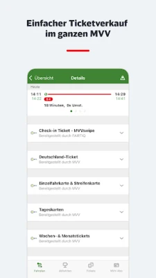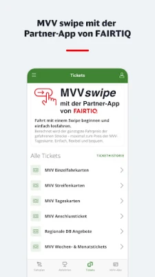 Experimenta la libertad de movimiento con la innovadora función MVVswipe. Integrada para tu comodidad, esta herramienta te permite viajar de forma flexible por toda la red MVV con un simple "swipe in" al iniciar tu viaje y un "swipe out" al finalizarlo, aprovechando la tecnología FAIRTIQ. El sistema calcula automáticamente la tarifa óptima al día siguiente, garantizándote siempre el mejor precio según las condiciones tarifarias de MVVswipe. Además, gestiona tus suscripciones sin esfuerzo a través del Aboportal. Accede las 24 horas del día para administrar tu abono, incluido el popular Deutschland-Ticket, así como otros productos de suscripción y tus datos personales desde cualquier lugar.