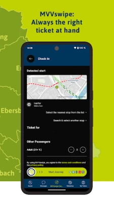 La gestión de sus billetes nunca fue tan sencilla. Con MVVswipe, solo necesita deslizar para obtener siempre el billete correcto al mejor precio, incluso sin familiarizarse con las tarifas de MVV. La MVV-App funciona como su máquina expendedora personal, permitiéndole adquirir con pocos clics el Deutschland-Ticket (abono de transporte público alemán) y toda la gama de billetes MVV, además de la CityTourCard y Munich Card. Disfrute de la flexibilidad de pago con Google Pay, Apple Pay, PayPal, SEPA o tarjeta de crédito (Visa, MasterCard, American Express). También podrá reservar servicios bajo demanda como FLEX, FLEXlinie y RufTaxi directamente a través de la MVV-App. Personalice su experiencia con ajustes individuales, como evitar escaleras, velocidad de caminata, transporte de bicicletas, limitaciones tarifarias o el modo oscuro, adaptando la aplicación a sus preferencias exactas.