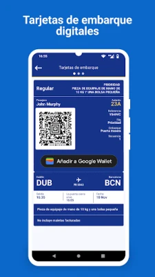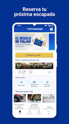 Disfrute de una gestión de vuelo sin esfuerzo gracias a funcionalidades intuitivas. Con la aplicación de Ryanair, decir adiós a las complicaciones es muy fácil: realice su facturación desde cualquier ubicación y en el momento que le convenga, y reciba instantáneamente su tarjeta de embarque digital en su teléfono, lista para escanear. Además, acceda con un solo toque a nuestra completa gama de servicios adicionales, desde la selección de asientos ideales hasta la prioridad de embarque, personalizando su experiencia de principio a fin para un viaje perfectamente adaptado a sus preferencias.